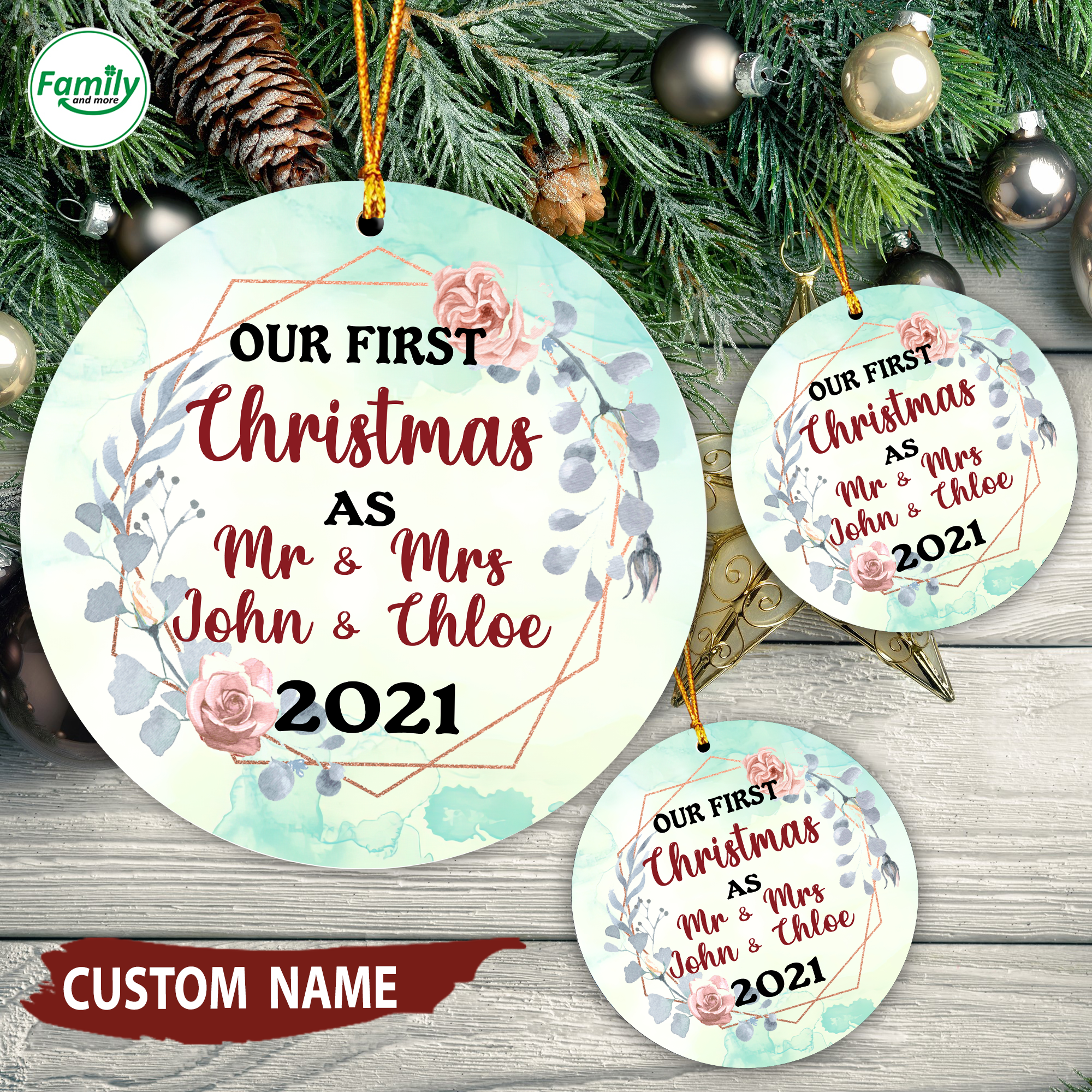 The round circle ornament  complete with gold hanging cord, this lightweight ceramic ornament will not weigh down branches. Get ready for this holiday season!